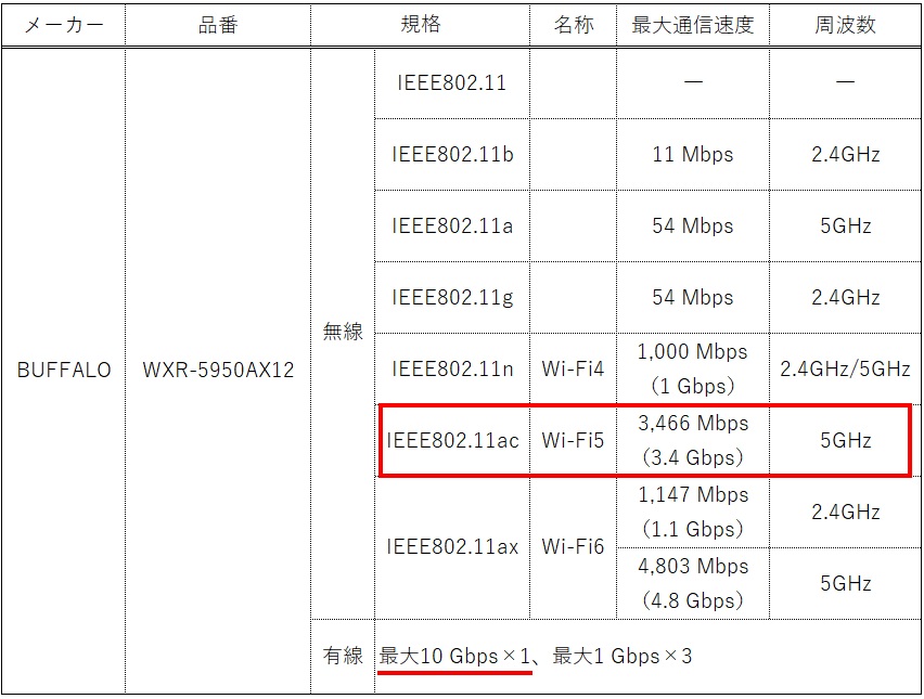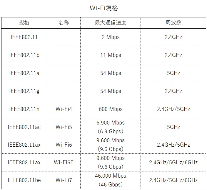 ちなみに、Wi-Fiの規格(理論値)は↓。