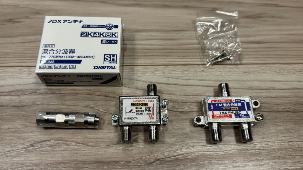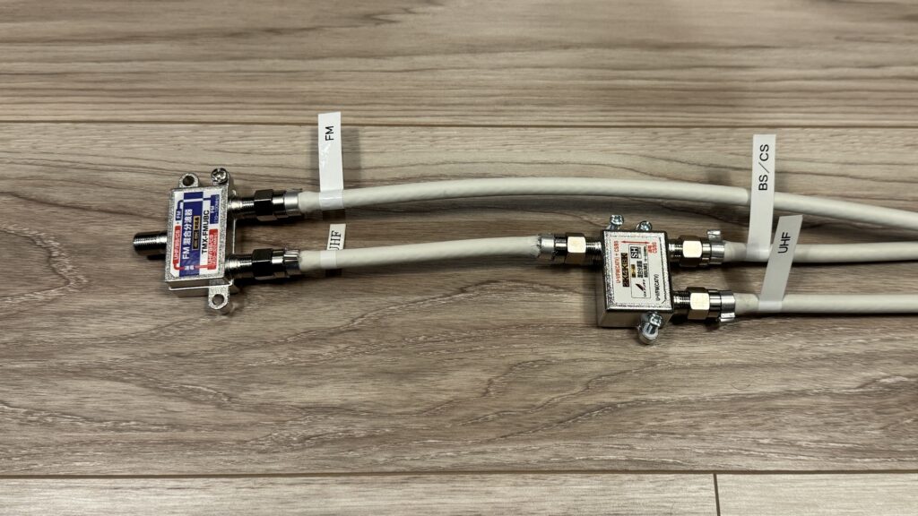 ↑左がUHFとBS/CSの分波器で、右がFMとUHF/BS/CSの分波器。