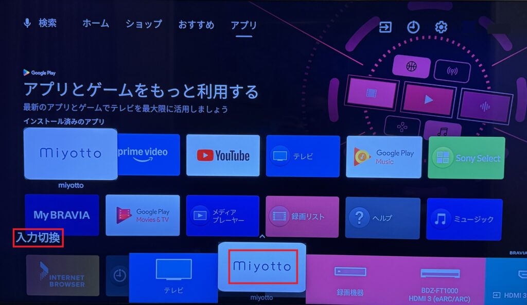 TVのリモコンの「入力切替」ですぐに「miyottoアプリ」にアクセスできるようにする。