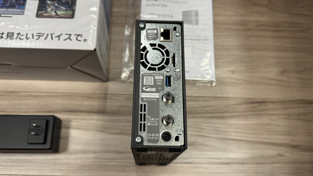 裏面もシンプルなもので、LAN端子、miniB-CASスロットル、アンテナ端子、AC電源端子のみ。