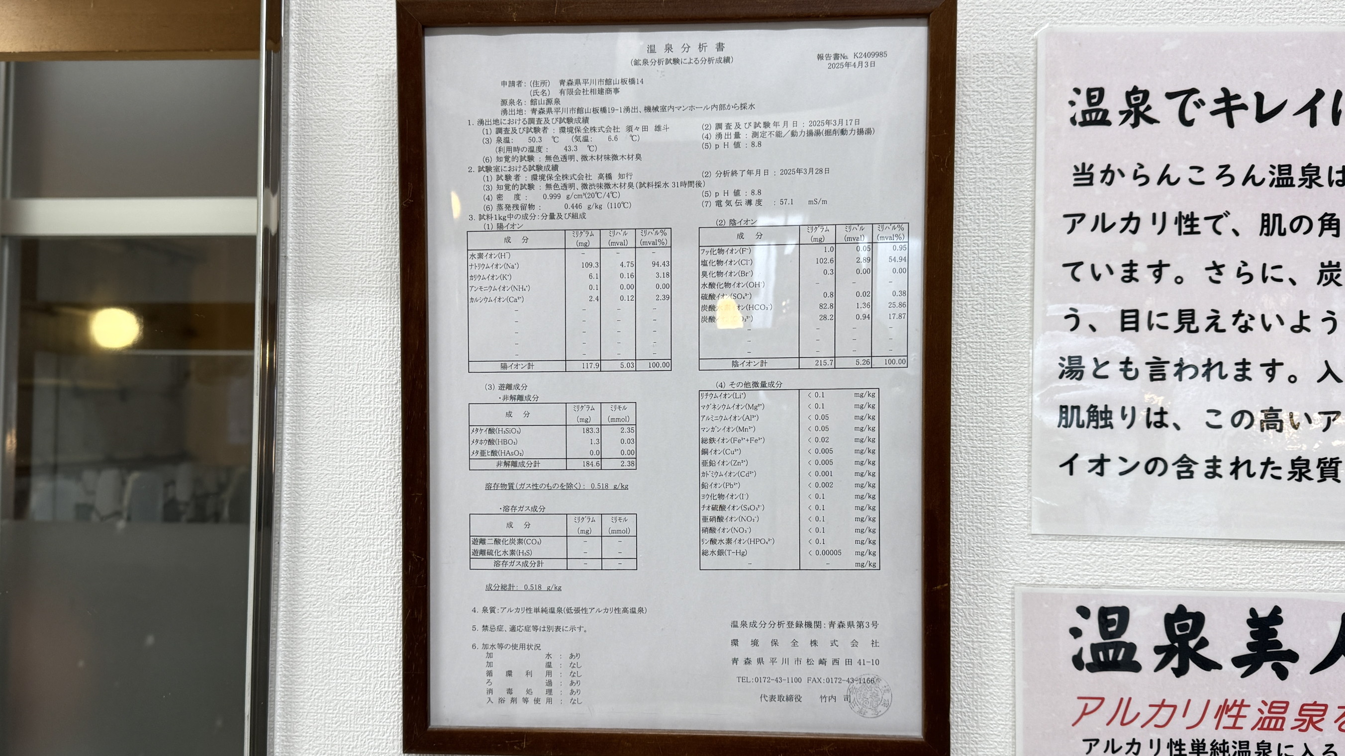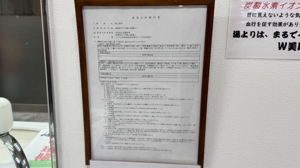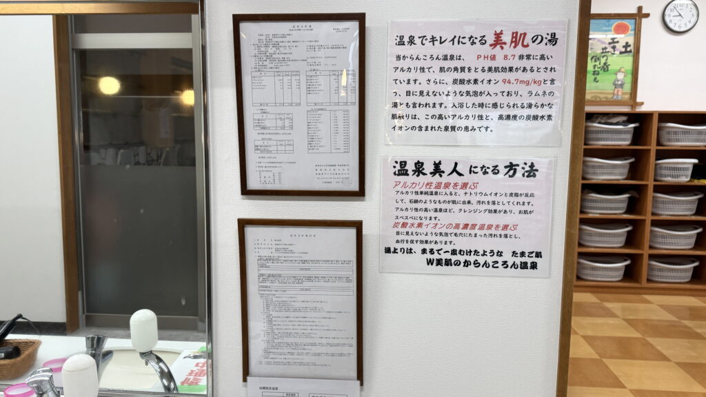 脱衣所にある掲示には、「PH8.7」と「炭酸水素イオン 94.7 mg/kg」と書いてあるが、その横の成分表では、「PH8.8」と「炭酸水素イオン 82.8 mg/kg」となっている。