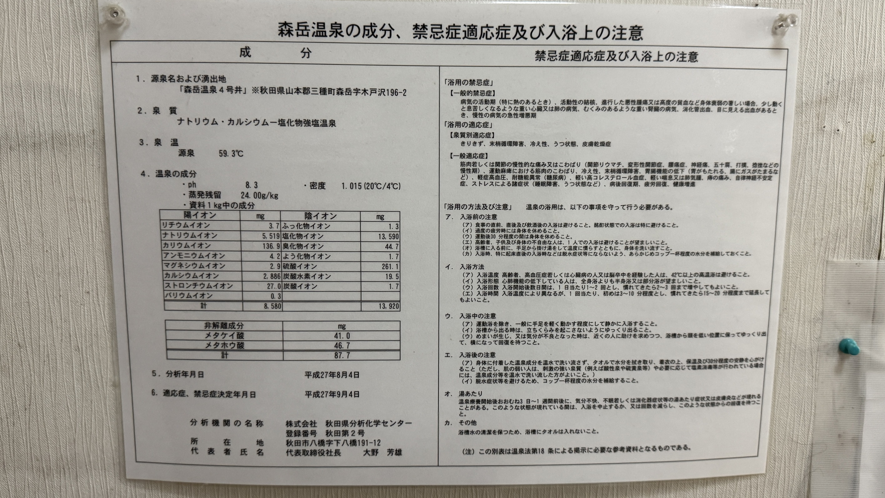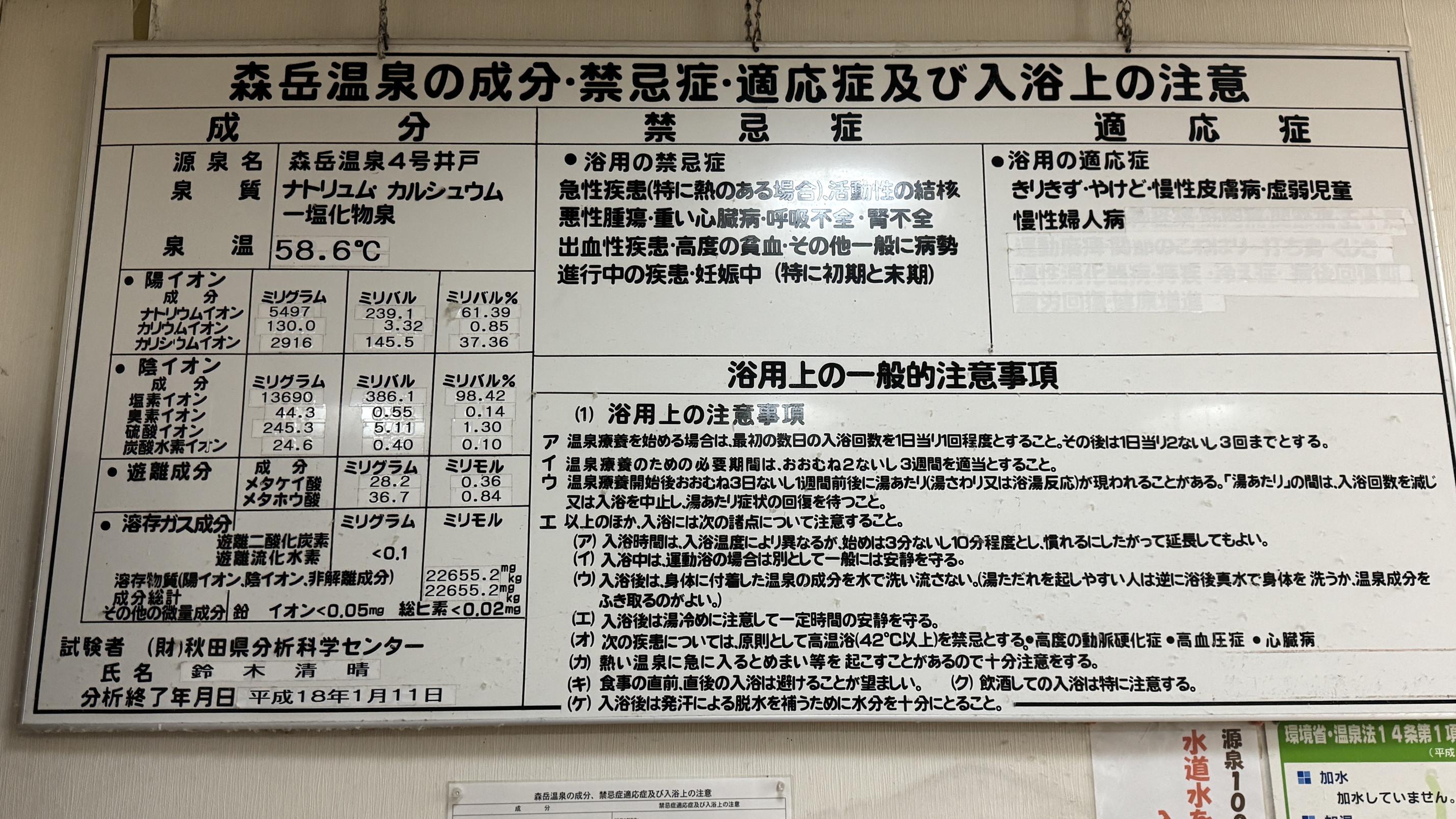 源泉は「森岳温泉 ゆうぱる」と同じで、「森岳温泉 ゆうぱる」の成分表は「2025年2月3日」の物があるが、「森岳温泉ホテル」に掲示してあった成分表を記載。
