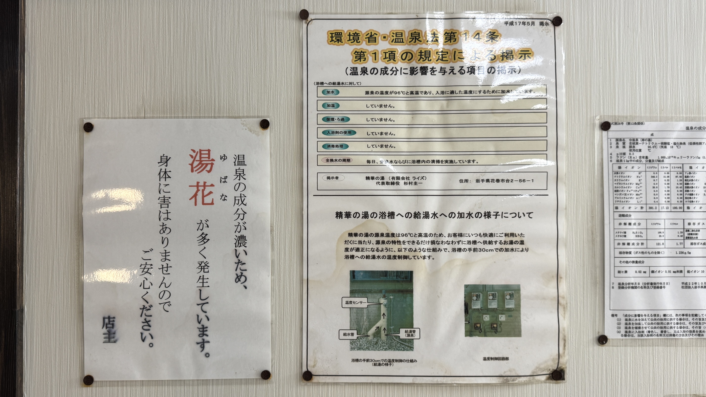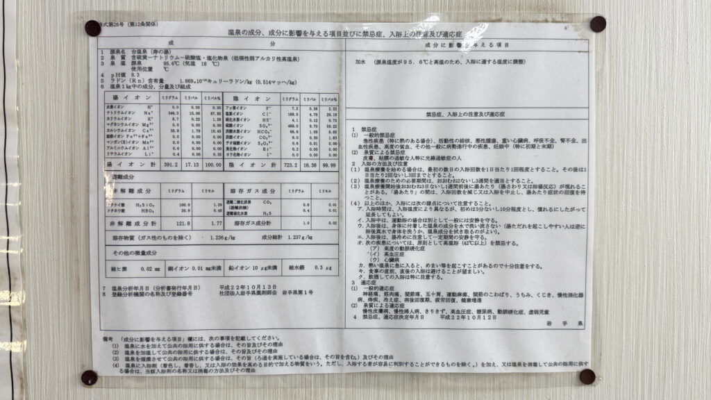 成分表を見ると、源泉温度は95.6℃とかなり高めで、成分合計もそこそこある。