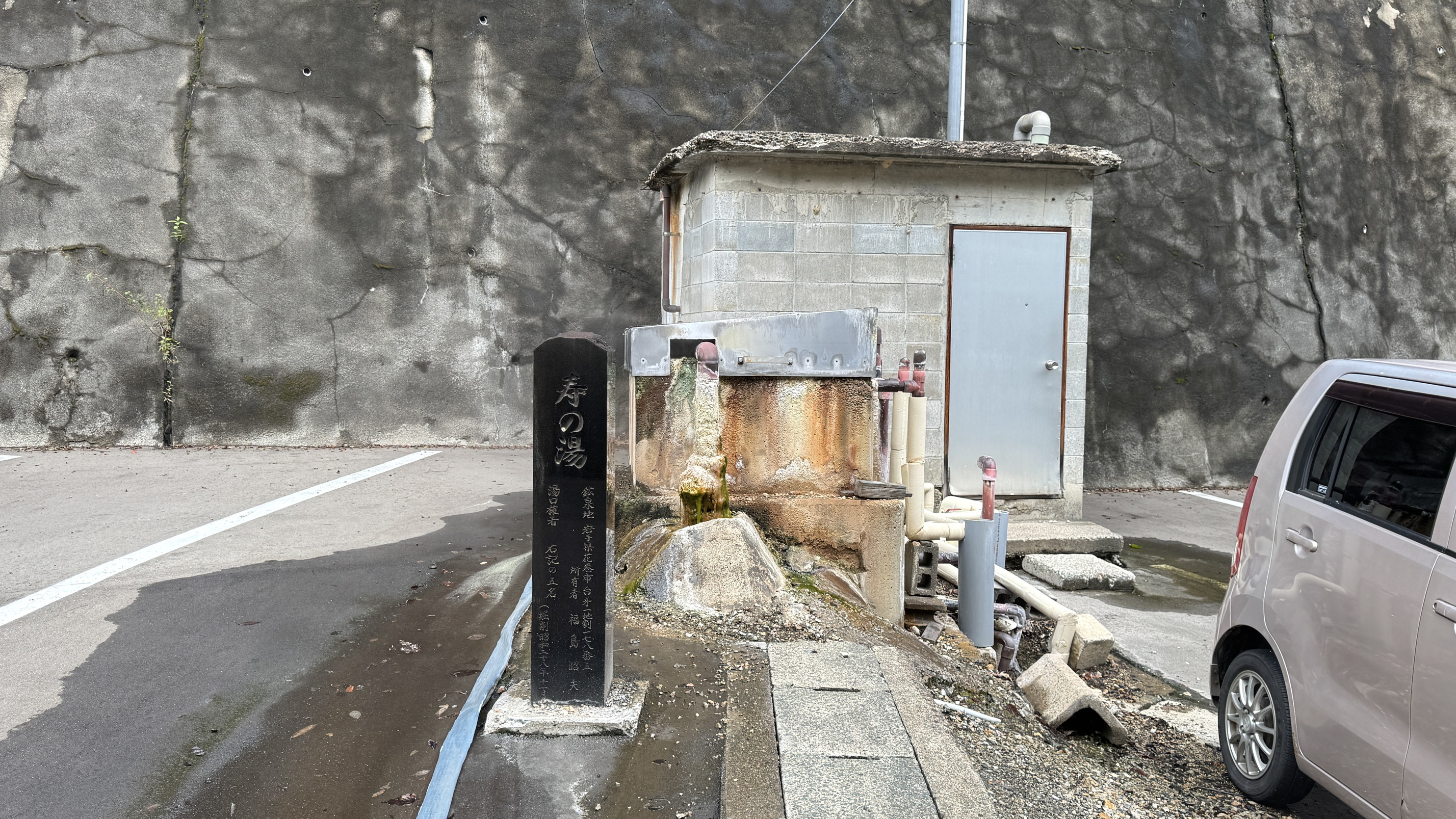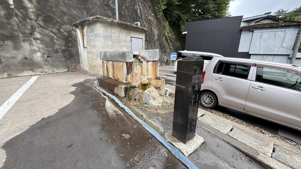 通りを挟んで反対側にも駐車場があり、ゴーゴーと温泉をくみ上げている音が聞こえたので見てみると、「精華の湯」の源泉である「寿の湯」だった。
