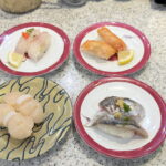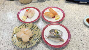 今日の夕飯は、車中泊なので飲めないので、回転寿司でガマン。