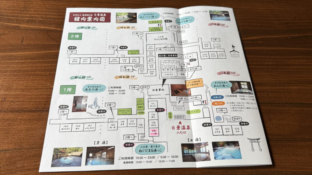 大浴場で2種類のお湯を楽しめるのが分かり、宿泊であれば大浴場が貸切状態なので、あえて貸切風呂に行く必要が無いかな。