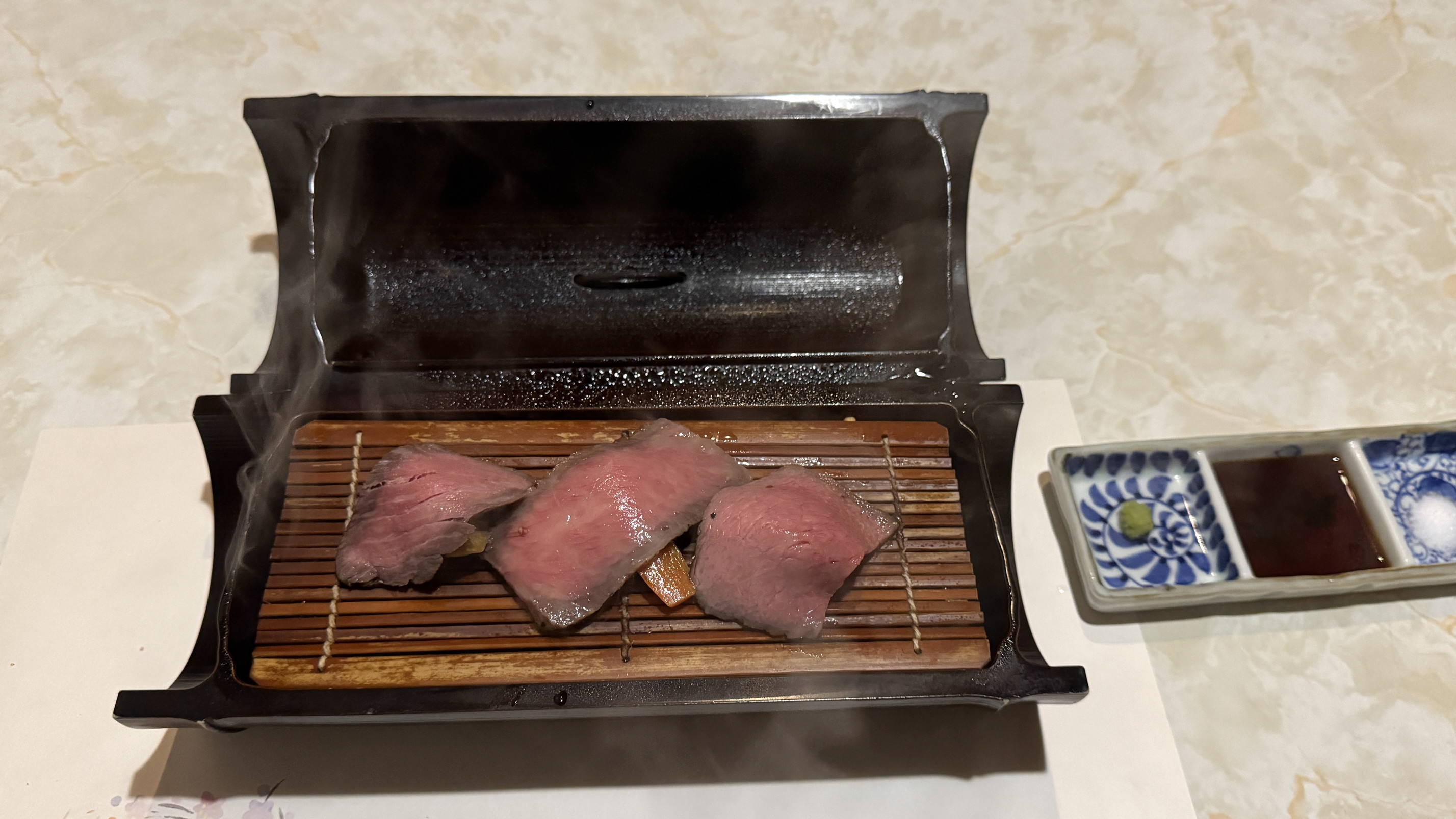「国産牛仔筒温燻」は、蓋を開けたら湯気がモワモワと。